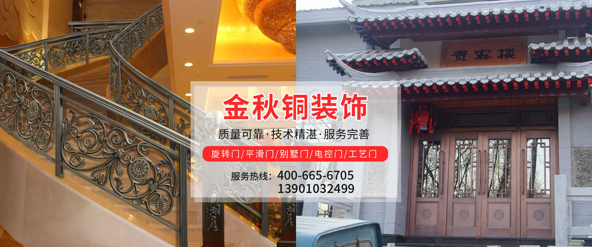 北京金秋銅裝飾材料有限公司是專業(yè)生產(chǎn)銅裝飾材料及設(shè)計(jì)、開(kāi)發(fā)、制造、施工、售后服務(wù)為一體的大型綜合企業(yè)。可承接建筑銅裝飾工程及五星級(jí)酒店、別墅、博物館、樓樘管所等高檔銅裝飾項(xiàng)目;生產(chǎn)各種規(guī)格的旋轉(zhuǎn)門、平滑門、別墅門、電控門、工藝門、旋轉(zhuǎn)護(hù)欄、屋頂銅飾防水瓦、浮雕壁畫......
